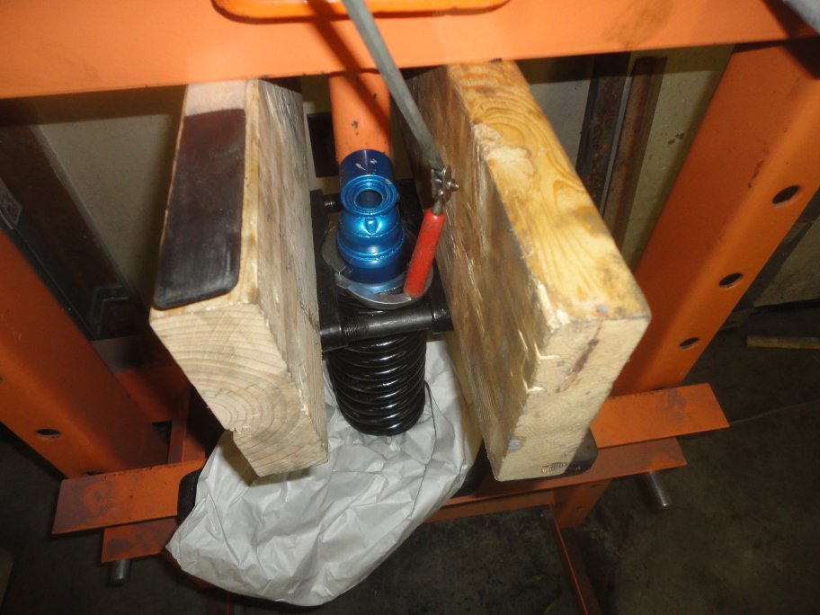 5) There are a few tricks to assemble the shocks. Some people use two brake rotors with two threaded rods to compress the spring. I prefered to use my press with my bearing puller. The rear springs are held in place in a very similar manner as an intake and exhaust valve. A collar is set on top of the spring which is then compressed. A two piece inner collar is dropped in place and the tension is released.