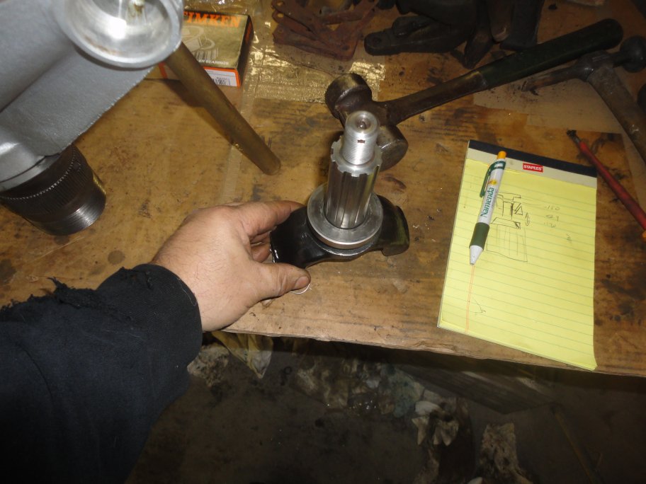 10) The next step is to measure the bearing float. I found this easier to accomplish by installing the splined yoke (seen here) for the measurement. In this picture you can see a sketch I made while trying to understand the procedure in the service manual. The special adaptor with the 0.150" step is at the top.