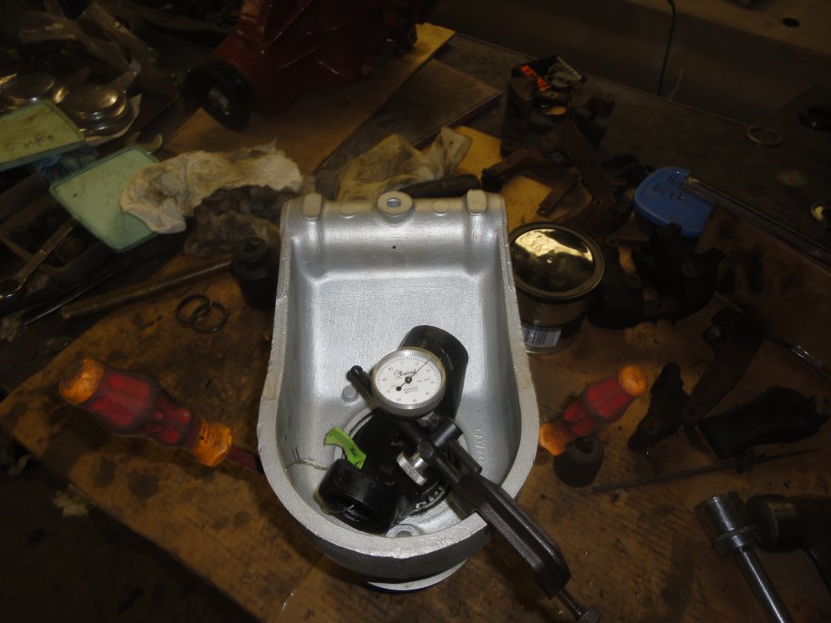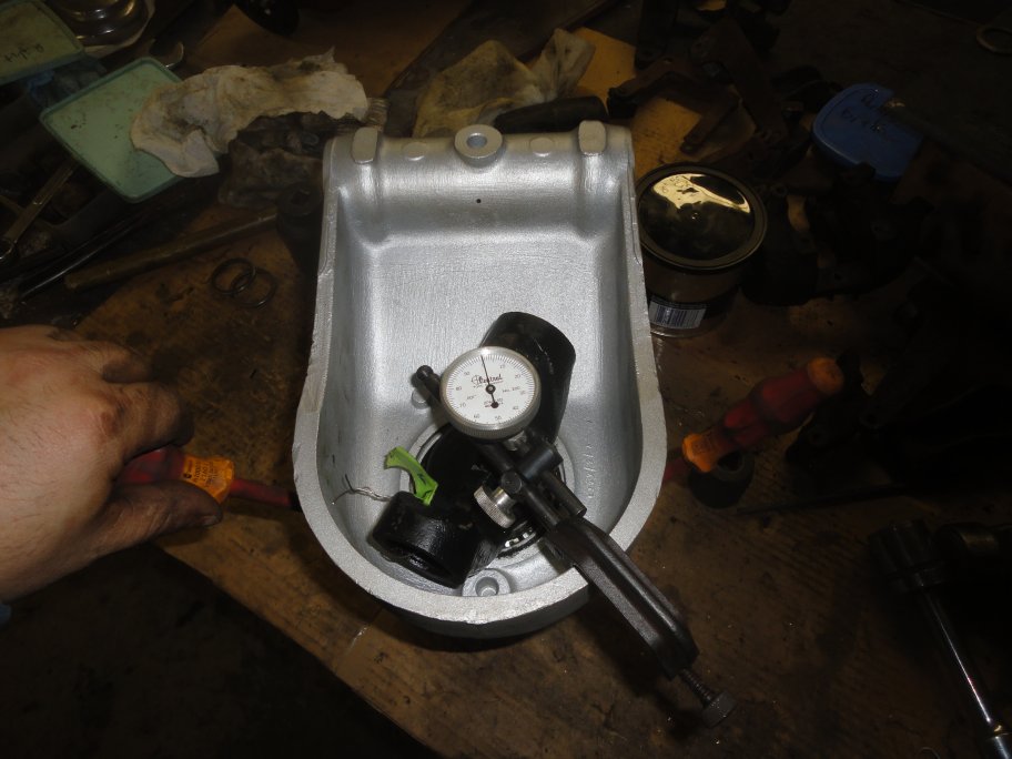 11) A dial indicator is mounted to the hub housing and the pin is set to contact the yoke. Note: In this picture the dial indicator was adjusted to read the float measurement that I had previously taken (0.015"). This is just the way I like to verify my readings. Normally it should be set to zero.