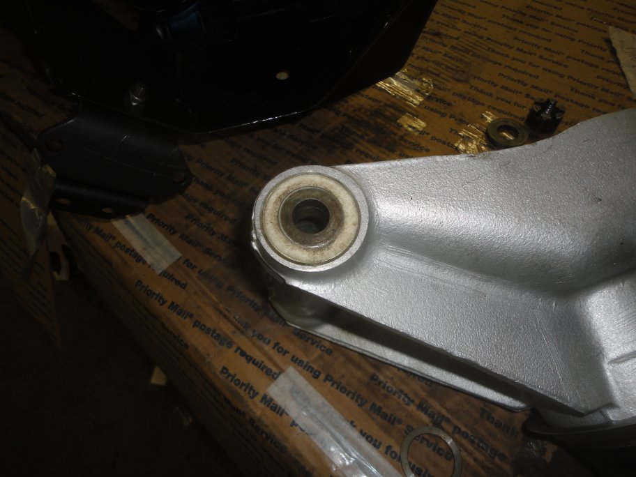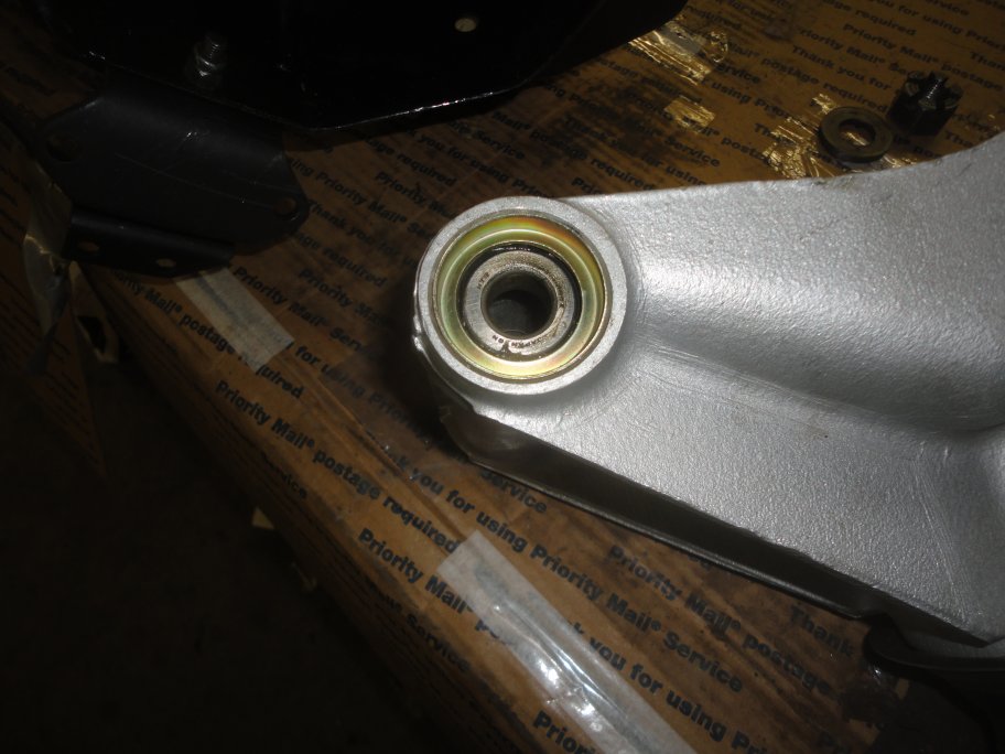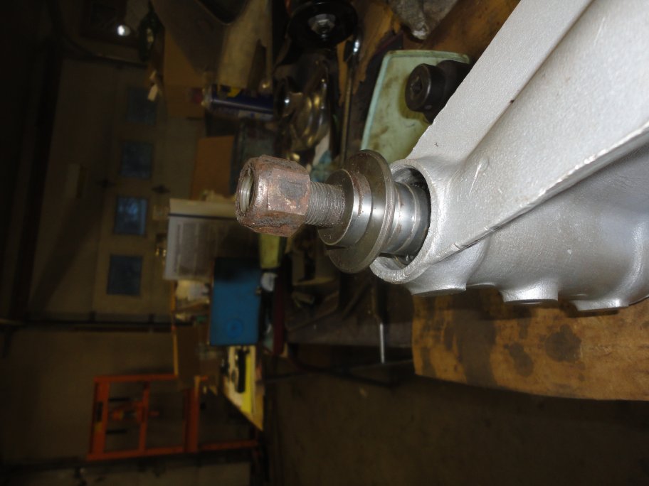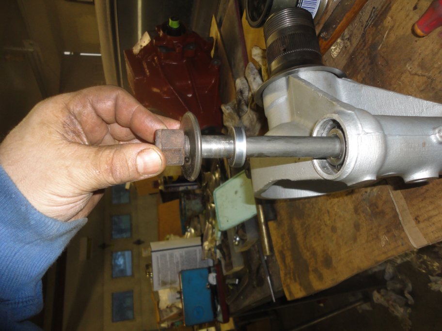 24) A stack of old spacers and the original nylock nut are installed. The nut is tightened down all the way. Unfortunately I did not take any pictures of the float measurement, so you will have to use your imagination. The float is measured by first mounting the hub assembly in a vise by a fulcrum shaft nut. A dial indicator is mounted on the opposite (free) end of the hub assembly and is set to contact the surface of the fulcrum shaft . Using a pry large screwdriver or small prybar, you pry between the vise and the hub assembly and measure the deflection of the dial indicator. Ideally it should read 0.005" +/-.002". If it doesn't then you will have to add or remove shims to get the proper float. Once set you take the fulcrum shaft
