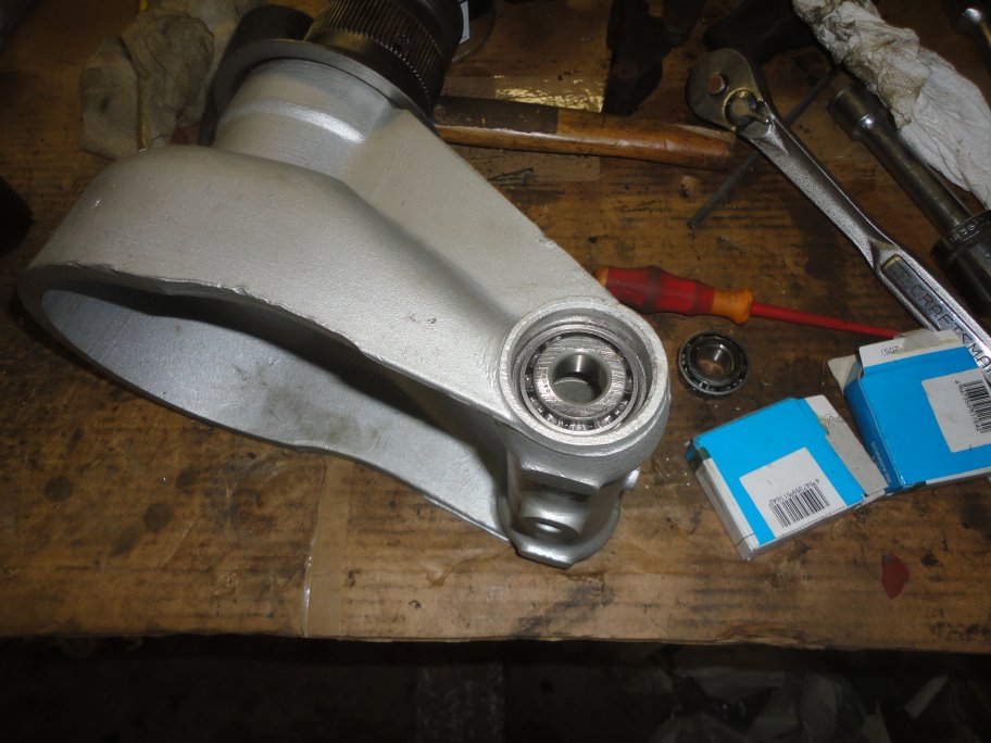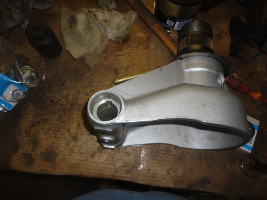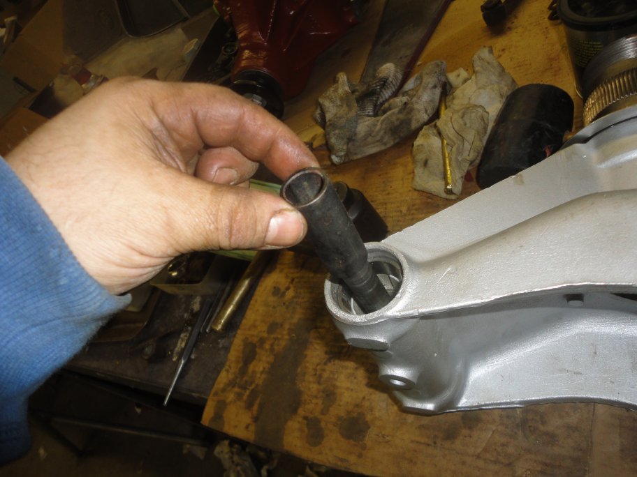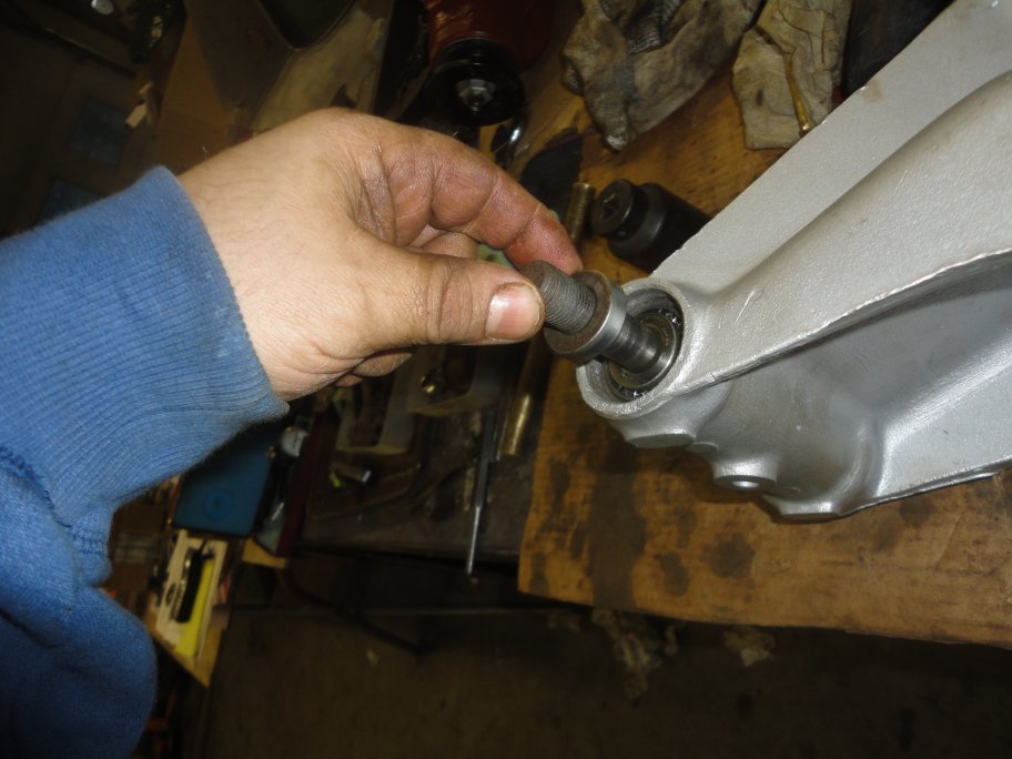 25) With the flaot set, the fulcrum shaft can come out and the bearings can be greased. It is recommended in the service manual to create a dummy shaft (less than the width of the hub assembly) to hold the tube spacers and shims in place until the hub assembly is installed. You could make one from a wooden dowel rod from your local hardware store. I just used a tapered punch to line things up during the assembly.