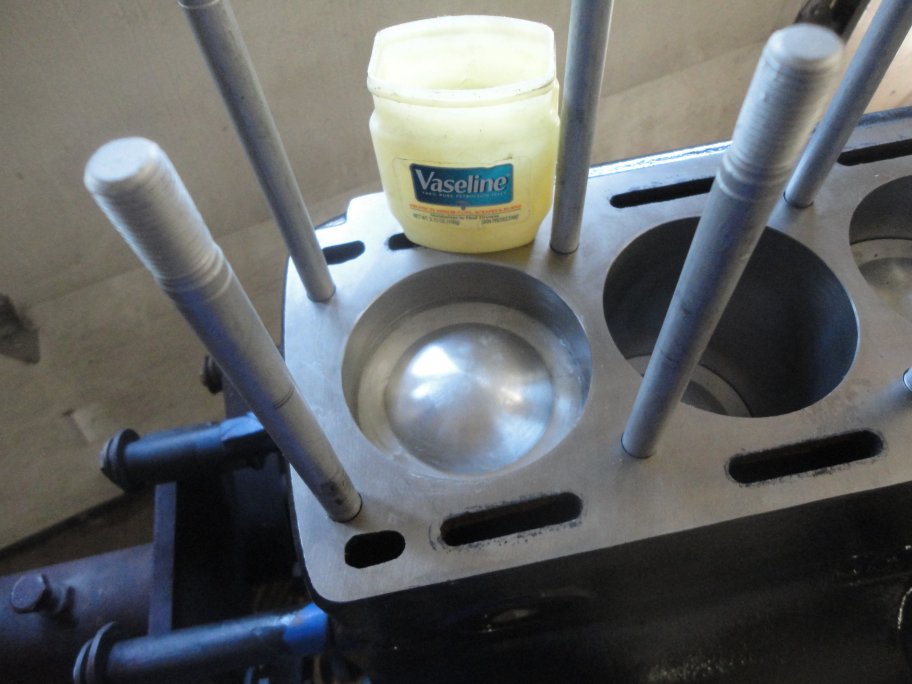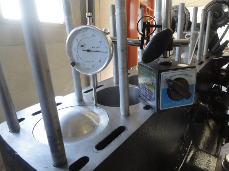 8) The dial indicator needs to be rotated over a piston (any piston) and the piston needs to be brought to the very top of its bore. This is actually pretty easy to accomplish.