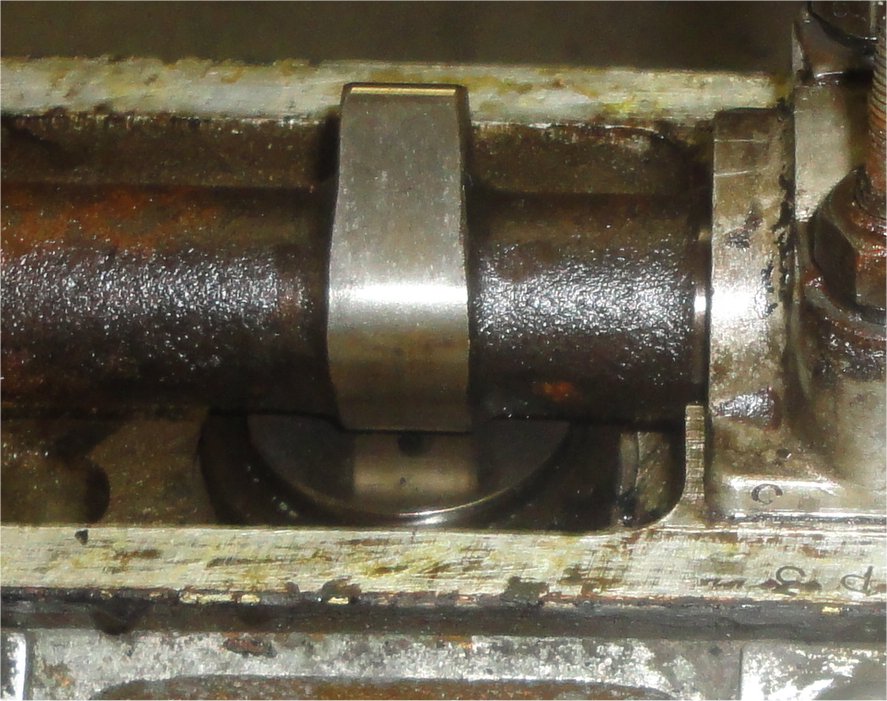 6) This picture shows an original shim in place on top of the valve stem. As you can see, it is quite the pain to set the valve clearance by replacing shims. You have to removed the cam and the tappet to swap out shims. When you are all done on one side, you have to removed the cam again to do the other side.