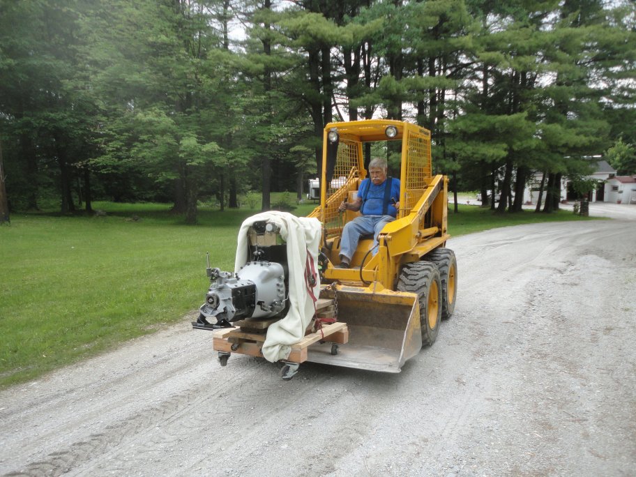 3) The engine was strapped down to a wooden dolley that I made specifically for installing the engine using a lift. It was then chained to the bucket of a skidsteer and was