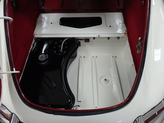 It helps to have the fuel filler hose installed on the filler pipe (not the tank). The hose can then be pushed down from the inside with a long screw driver. Also, the rear lip of the boot that the boot board rests on needs to be bent down at an angle. I had straigtened mine during the restoration, but found I had to bend it back where it was. Seems to be a common them with these cars. If you come across something bent, don't straighten it. It probably was bent for a reason.