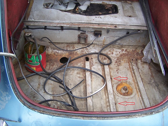 3) Here is an original picture of the boot before I started taking the car apart. The red arrows point to a pair of clips that were attached to the boot support. These clips are sort of a mystery. The factory was not supposed to install them on a car that was built after mid-June 1962 (after LHD FHC #886246), but there they are.
