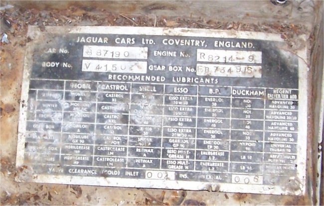This document contains the production record for the car in question. I will post a copy of mine when it arrives. Since my car has obviously never been restored and the data plate has never been removed, I can be reasonably sure that everything is original since all the numbers agree with the data plate. Upon close examination of the car during taredown, it was pretty obvious that the car is 99% original. The only changes that I could find were the brake pads, distributor cap, rotor, plugwires, spark plugs, radiator hoses, waterpump, leather shift knob, interior door handles and window crank handles. The latter three changes appear to be Jaguar dress-up items. The originality of the dashpad is in question. What doesn't appear on the data plate is the color of the car or the color of its interior. This makes it possible to change the color of the car and still be considered correct as long as the color was available at that time. This leaves it open as to whether or not I should change the color. I have planty of time to decide, but I do know that it will NOT be painted British Racing Green. I do not see many classic Jaguars where I live, but a majority of the ones I see are British Racing Green. |