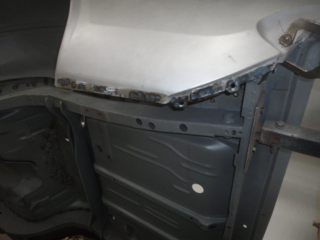 78) For the front patch of the wheel well, I used a section of a new repo panel. Here it is welded in place just before the