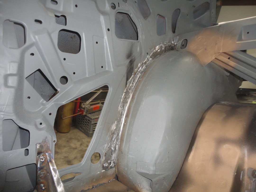 97) This picture shows the pinch welds at the rear of the outer wheelhouse where it meets the trunk drop off.