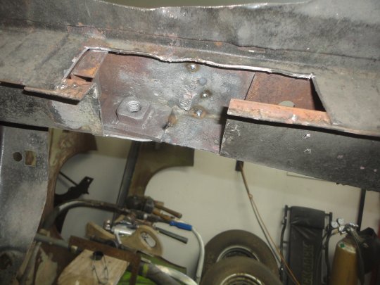 131) I sprayed some weldthru primer on the repairs to protect them from corrosion while I worked on the radiator support. I should mention that I test fitted the K-frame to ensure that things still lined up after the frame rail repair. I also compared measurements of the frame and compared them to the measurements in the service manual. Things still were in alignment. Wheh!