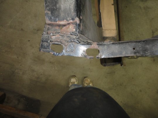 130) Here's a shot from the bottom. You can see that the notches don't quite line up. This is the way it originally came from the factory. You can also see the pinch welds I made to dress up the seam. As with the right side, no filler will be required to pretty up the repair.