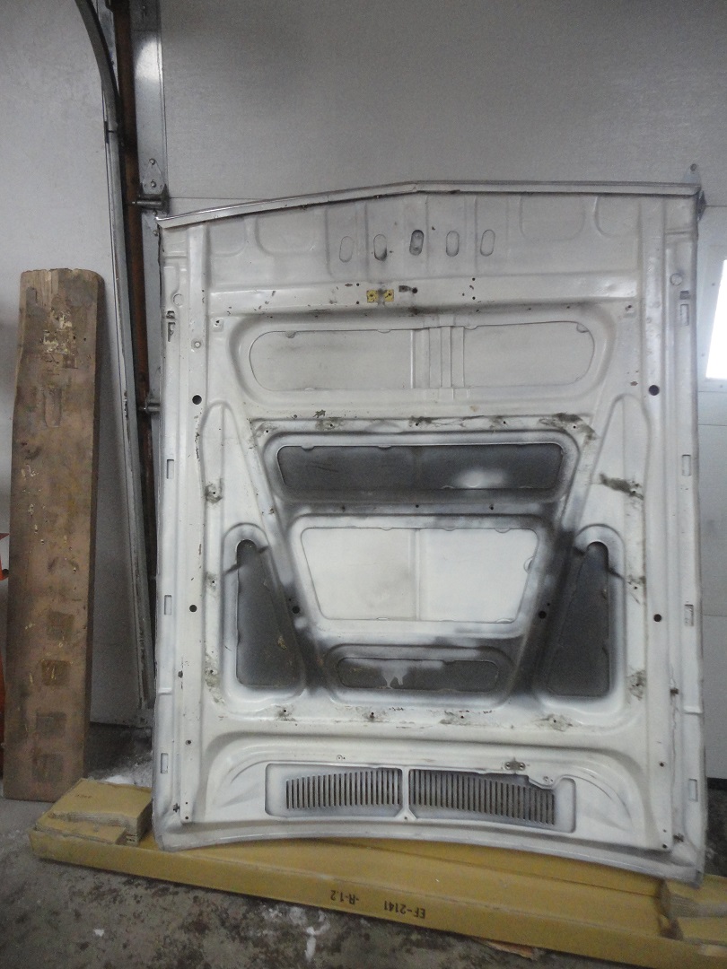 192) The top side of the hood was chemically stripped with Aircraft Paint Stripper. I have yet to see a perfect hood. People who sit on their hoods create a lot of work for people down the road. Though this picture makes the hood look terrible, most of filler was not very thick. I could have skipped most of it and waited for the highbuild primer step to take out the imperfections.
