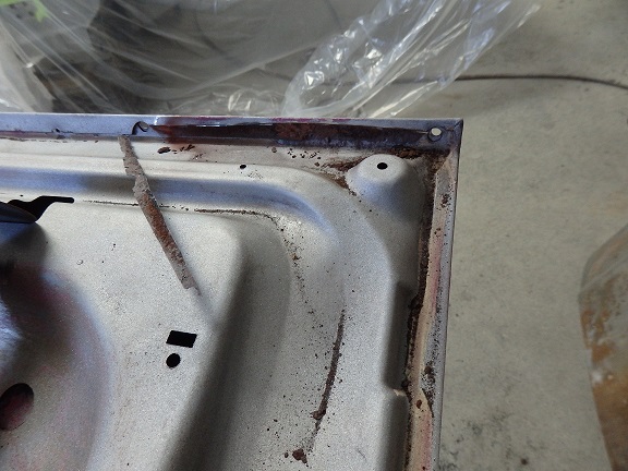 195) The seam repair took a bit of time. I cut the rusted sections out while leaving the original edge in place. In this picture I had cut off one piece. There were six pieces in all that needed repair. I sandlbasted the joint clean and welded in a new pieces that were shaped like the original pieces that were cut out.