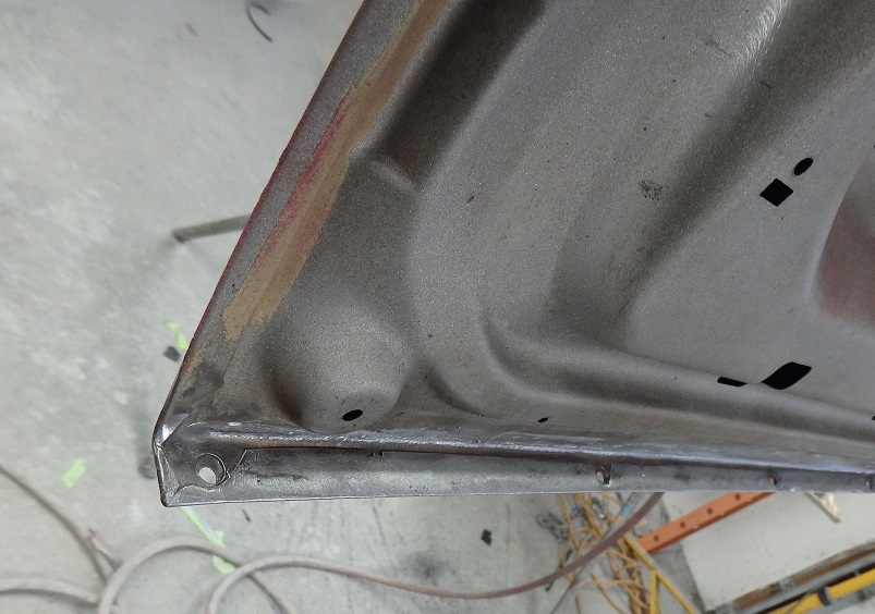 194) The trunklid needed a bit of work. The bottom seam was quite rusted on the underside and there was a factory "correction" that needed fixing. In this picture you can see an area, perhaps a foot long, where the metal was heated and folded. This was found under the original paint, which makes this a factory repair. It appears that there was a defect in the panel that they had to heat up and pound down to close the trunk lid all the way. This was easy for me to clean up. I just mig welded along the lenght of it and ground it down.