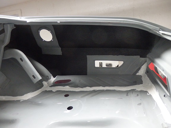 223) The black seam sealer stops at the front of the trunk pan under the package tray. The steel floor pan plugs were actually installed prior to the primer dip and painting process. On the inside of the car they were sealed with black seamsealer.
