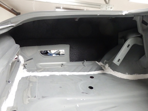 In this picture you may notice the screws coming up through the floor at the base of the tail panel. These are the screws that hold the rear bumper upper filler panel in place. The filler panel was originally installed prior to paint and was even seam sealed from the outside. I've seen many restored cars where the filler panel was installed later. This would not be correct since the screws are visible and they should have seam sealer on them and should be painted body color.