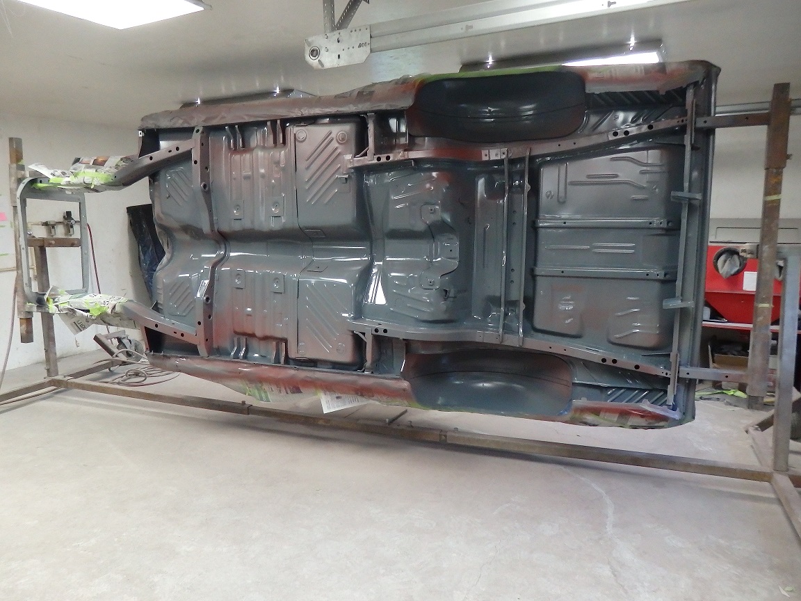 228) And at last there was paint! Originally the factory would have dipped the car half way up its side in a vat of water soluable gray primer (dip gray). The primer on the outside of the car was then hosed off before the primer was baked on. In the end the primer is only visibly from the undercarriage.