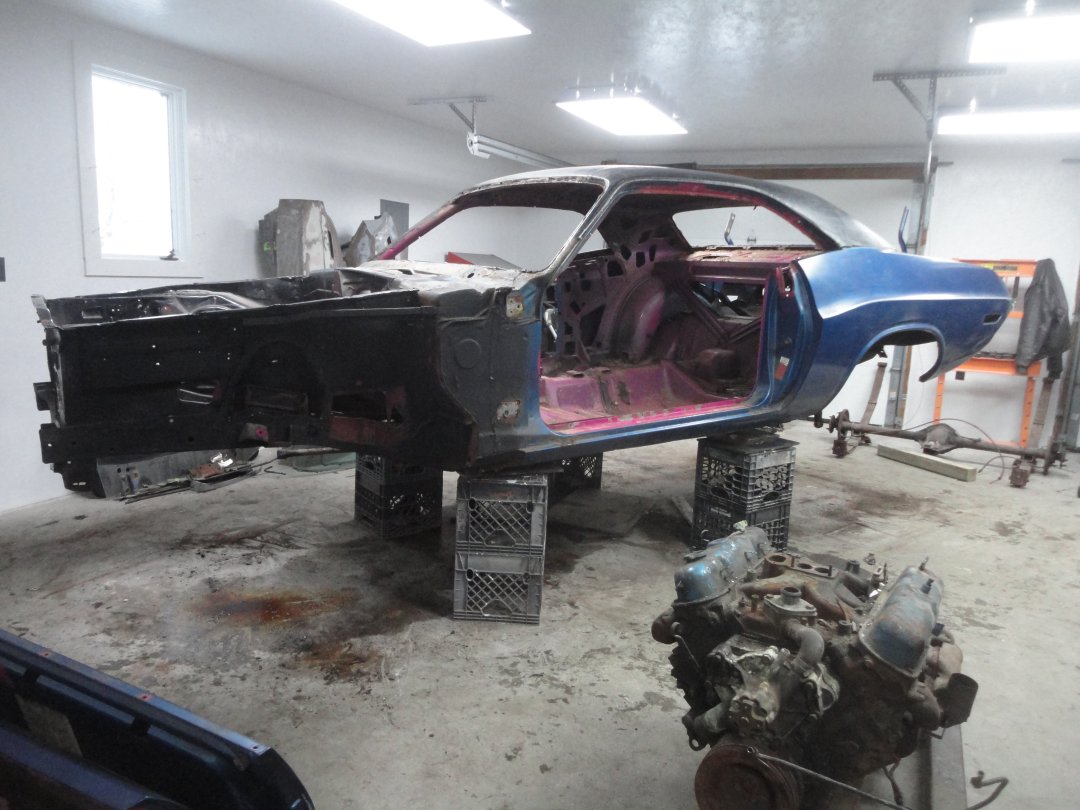 The car actually sat all spring, summer and fall before I started to work on it. I had a lot of things to finish up on the 63 Jaguar before I could start a new project. I also remodeled the interior of my shop which was long overdue. Finally, with winter setting in and some free time on my hands I decided to dismantle the Challenger and put it on the rotisserie (December 2014). I am not going to bother going into detail on how I took the car apart. Though I did take about 900 digital pictures and recorded about a half dozen videos during the taredown process.