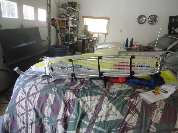 384) I was able to rebuild the grill with new repo pieces that I got from Roseville Moparts. Luckily I had the missing bracket on the original hood latch support.