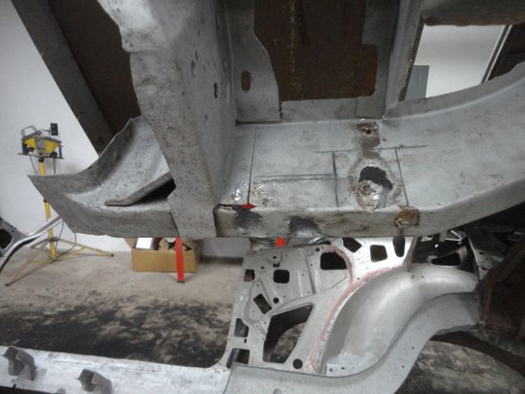 13) I was very lucky to discover an original factory inspection mark (orange). I will faithfully reproduce this after the car is painted.