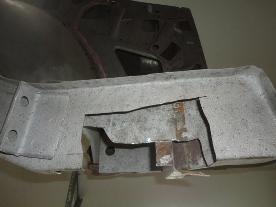 9) The first actual repair was the area shown here on the left rear frame rail. I had to cut part of the rear reenforcement off to get to one