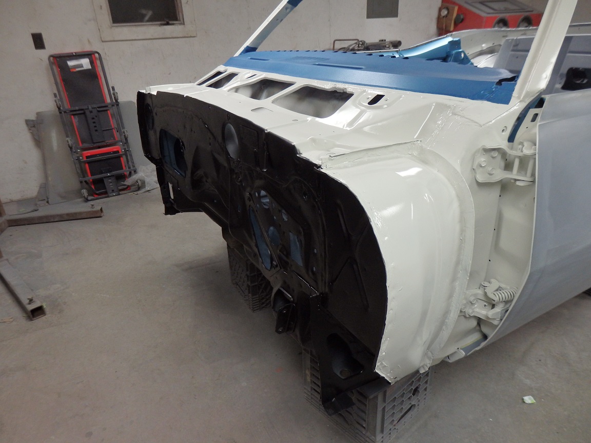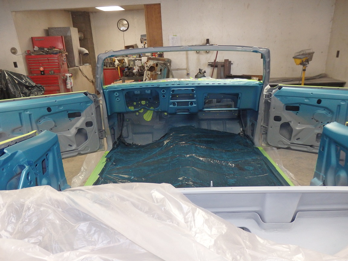 With the body off the rotisserie, the finish paint work could begin starting with the dash top. The top of the dash is PPG 13217, which is a dark blue lacquer paint with a suede additive. This could not be bought local anymore since lacquers are a thing of the past. However, I was able to have a pint mixed Instrument Specialities. I think the color came out great. It is a darker blue than the rest of the interior paint. It is supposed to match the dash pad, which is also darker than the rest of the interior. The suede additive gives the paint a nice texture and it holds down the glare. |