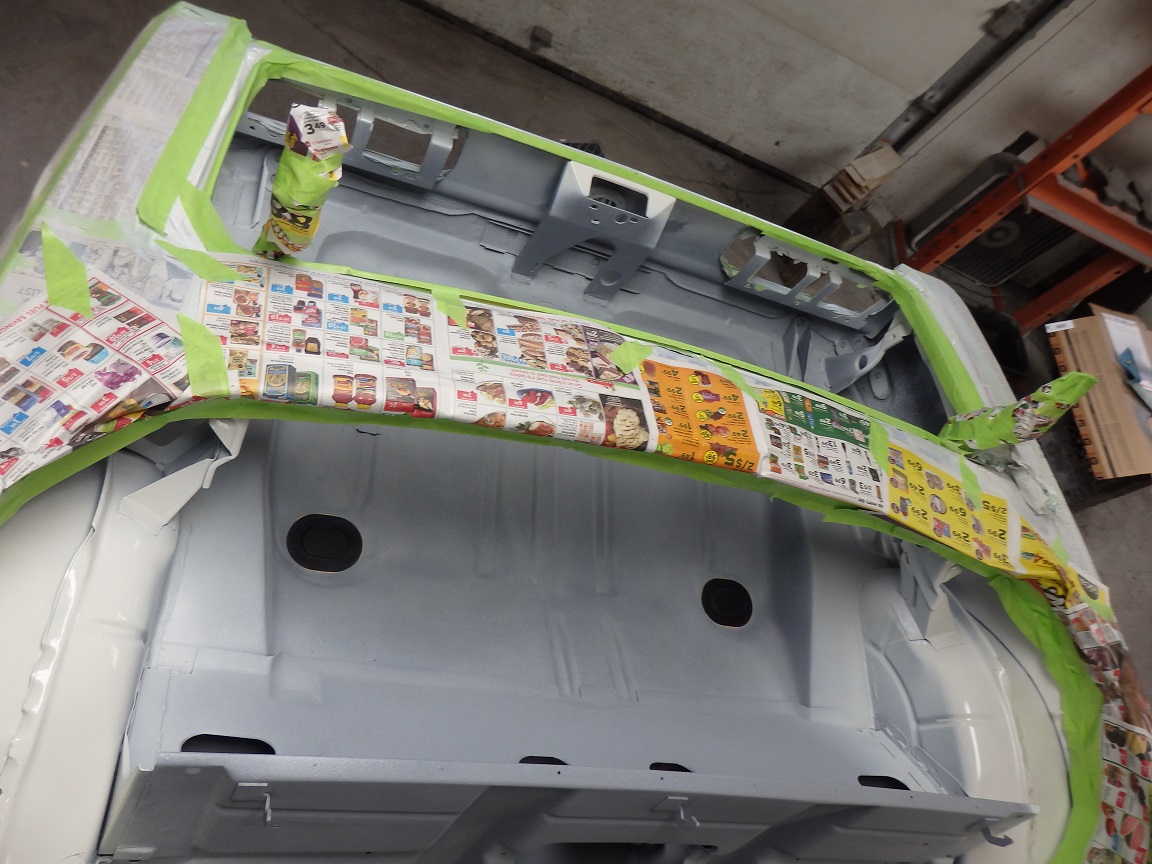 The factory blacked-out the firewall after the car was painted, I wanted to get that out of the way earlier to keep the black dust out of the garage before painting the car white. With the doors installed I painted the cowl top and sides along with the inside faces of the doors. This produced a factory correct look on the door hinges without having mask lines. Also I didn't have to risk damaging the paint by installing the doors after the car was painted. The factory never masked the firewall when they blacked it out. So no mask lines should appeared at the top of the cowl. The black paint appears misted over the body color on original cars. The way I did it was to mask off all of the white except for the top of the cowl. I loosely taped down a piece of cardboard over the top of the cowl. I then painted the firewall. At the top of the firewall, I painted downwords so that paint would kind of fan out under the cardboard a little bit. This method seemed to work out well. |