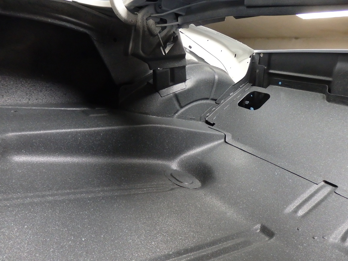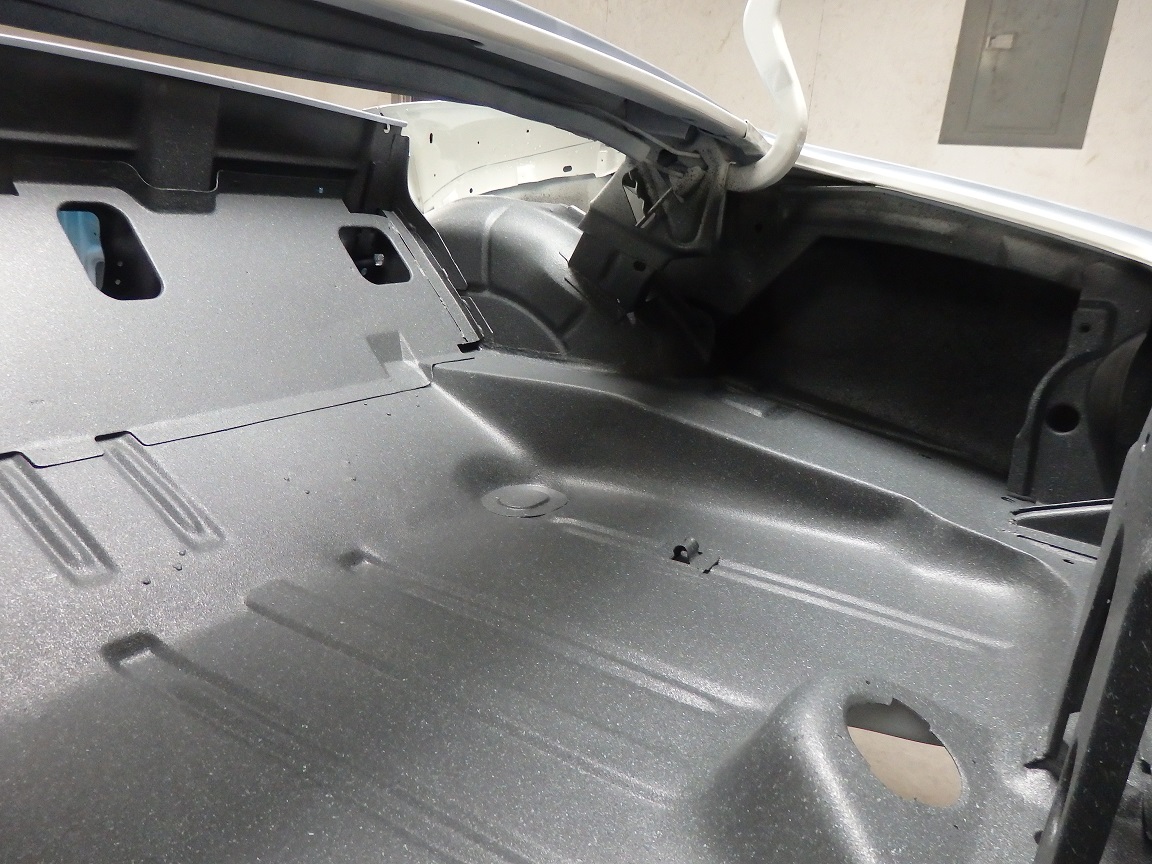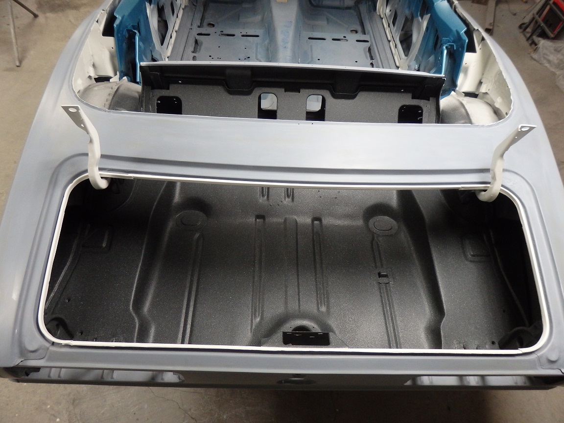 The trunk was another story. To get the inside of the quarter panels to look correct I coated them with a special undercoat created by Resto Rick, though originally intended for the Mopar restorer, it is perfect for GM restos as well. With the outside masked off, I painted the perimeter of the trunk and convertible top well body color by mimicking the way the factory had originally did it. The first pictures shows this area masked off waiting for the spatter paint. The factory originally painted the trunk with a black/acqua water based spatter paint. This is difficult to reproduce and there are only a few places that offer anything that comes close. I used PP-20-TS02-QT trunk spatter black acqua produced by "The Parts Place". It only looks good when it is sprayed over a back background, so a sprayed my trunk first with DP90LF black epoxy primer. After it had cured for about a day, I came back and sprayed the spatter paint over it. The factory was kind of sloppy when they spattered the trunk, so I reproduced the original look. The last picture is a prime example of how sloppy it looked from the factory. |