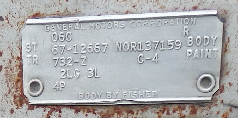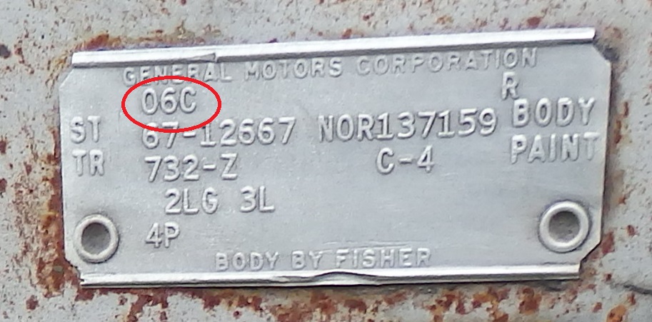 The code in the top left corner indicates the month (06=June) and week (C=3) that the body was manufactured on. So knowing this one should expect the car to have late-67 features on