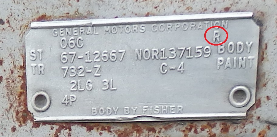 This car was built at Norwood so the code R represents the interior paint code, which is Bright Blue. Otherwise, the code in that location would have been the body scheduling code for the Los Angeles plant.