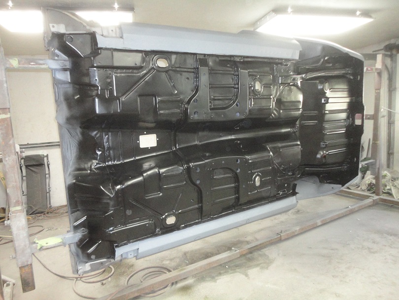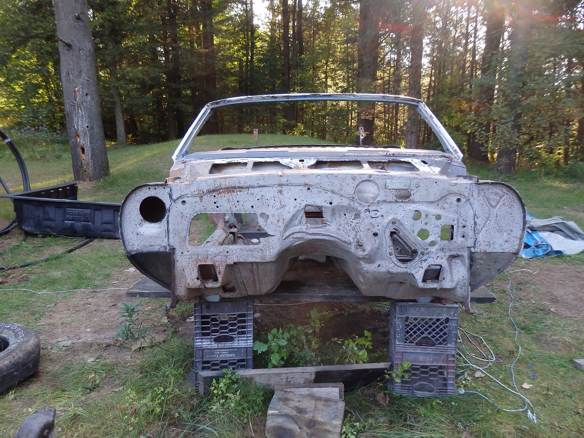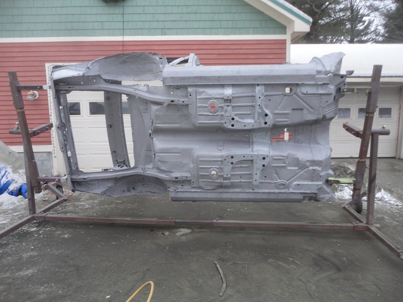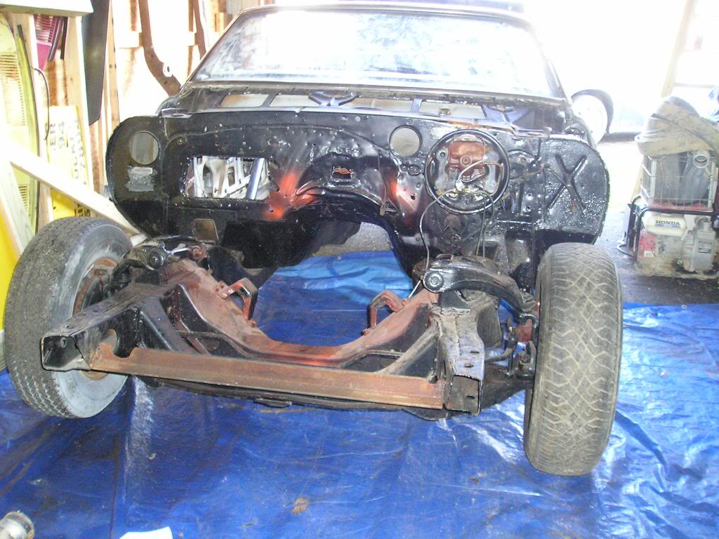 The second picture is what it first looked like when I put it on my rotisserie 2 years later. In this picture I had removed the frame reinforcements that were welded in to stiffer the car for drag racing.