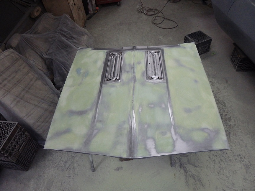 It took me an afternoon to get the jambs fixed on the hood. For the top side I used DL50LF gray epoxy primer, but for the underside I used black DP90LF since the underside was supposed to be black. I like to use