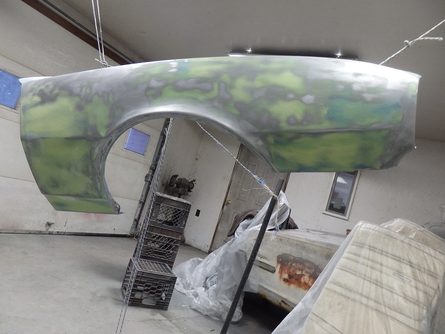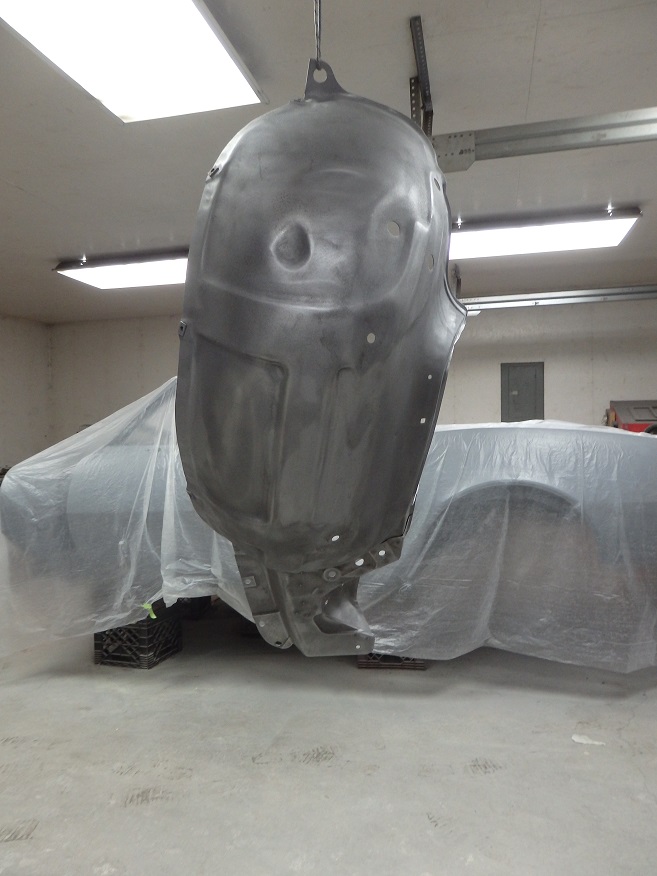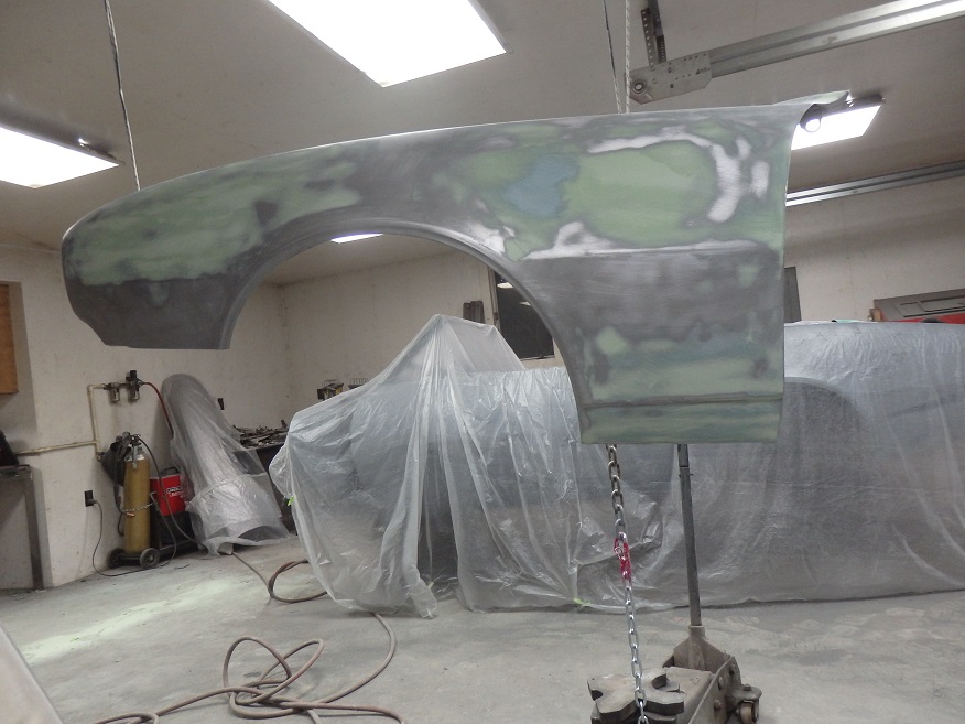 With the filler work completed, I hung the fender from the ceiling and epoxy primed the whole thing.