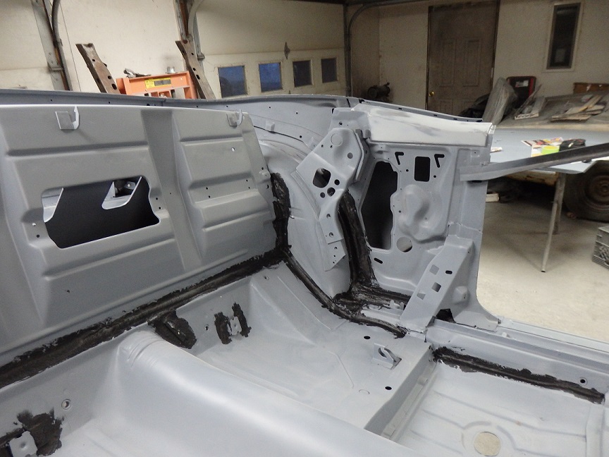 I like to start the painting process with the undercarriage. This involves putting the body back on the rotisserie. Before the undercarriage could be painted however, the body needed to be seam sealed and the inner quarter panels needed to be undercoated. This is because the seam sealer and undercoat can flow through the cracks, which would show up after the painting if sealing would have occured later. For the inside of the car, I used BackJack Neoprene Super Fast Cement #99. Though actually intended for roofing, this sealer flows very well and looks like the original sealer used by GM. It has the extra advange of being paintable. For the inside of the trunk and firewall I used 3M Fast n' Firm 08505 using a paint brush to smooth it out. It takes a few days to dry, but dries the correct yellowish white color. For quarter panel undercoating I used a special mix sold by Resto Rick. Though he works on Mopars, the undercoating he came up with looks very correct for GM cars as well. It comes in a gallon can and is sprayed with a rocker schutz type gun. It's messy to work with, but the final look is awesome and it is paintable. I highly recommend it. |
