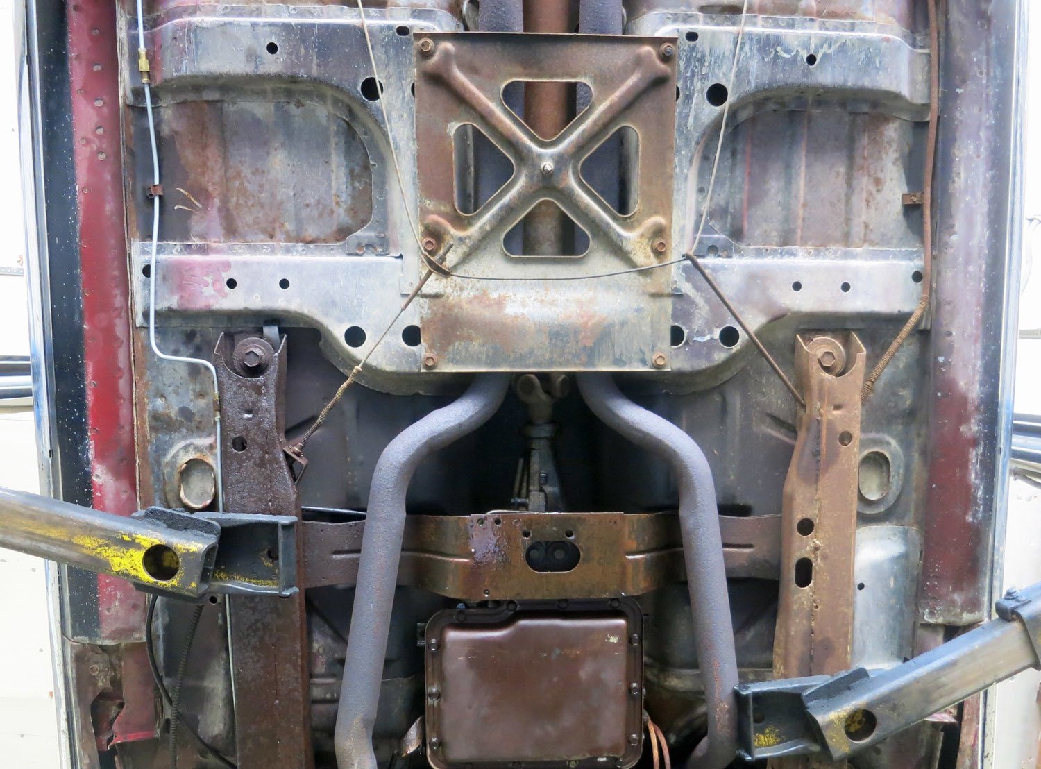 My intent with this car was to replicate what the undercarriage looked like when the car came from the factory. The problem was, the undercarriage was sandblasted when I got it. I had no idea what it was supposed to look like. So I turned to the web forums and looked for pictures of restored cars. I had a hard time finding what was correct. What complicated the matter was that for some reason judges want the undercarriages to be painted uniformly semigloss black even though the cars never came from the factory that way. I searched the forums for a reason why and it seems they want the undercarriage to look the way GM "intended" it to look and they seem to think that a restorer can do a better job than GM did because they have the time to do it correctly. Really!? you have to have overspray on the hoses and valve covers, but you have to deviate from original just for the undercarriage. What a double standard! Fords and Chrylsers all had ugly oversprayed undercarriages and those judges want to see it that way. The way GM inteded it to looks is how it came from the factory. Take a look at any modern car. The undercarriage has body color overspray on it. Auto manufacturers never cared about the underside of vehicles.... Some restorers ARE restoring their cars to look like what their cars originally looked like. I've found a few pictures on the web, but they are most from Van Nyes built 69's, which are done a little differently. I did find pictures of an unrestored 67 SS convertible on e-bay that was built in Norwood, like mine, that was adequate enough for a reference. Here it is: Noticeable things include, mostly black undercarriage with lots of red body color overspray that goes all the way to the transmission tunnel, black overspray over the red overspray, the underside of the rocker panels does not appear to have fully received blackout paint and no black paint where the front fenders bolt to the rockers. From pictures of this and other unrestored cars and with this great First Generation Camaro Assembly Process article, I was able to come up with what I think was the correct look for my car's undercarriage. Here is what was done at the factory: 1) PHOSPHATE PROCESS: The raw body went through a seven stage phosphate system to clean the metal and prepare it for paint and primer adhesion. I don't believe this left any color behind. 2) INITIAL PRIME PROCESS: The entire body was manually sprayed with primer and was then baked dry. Confined areas subject to corrosion were given a second coat of heavier primer material. I believe this left the undercarriage coated with a black primer. This is probably why the judges want to see black undercarriages. 3) INTERIOR PAINT APPLICATION: Interior paint was then applied to the instrument panel, package tray and upper doors (67/68 only) and upper quarters (67/68 only). A coat of air-dry flash primer was sprayed from the beltline down (probably the redish brown primer found on the inside of the car). 4) EXTERIOR PRIMER: The interior color was masked off and the outer body was sprayed with gray primer, which oversprayed onto the undercarriage (some cars may have more primer overspray than others. The interior paint and primer were baked dry. 5) SEALING: The body was seam sealed, the floor pan plugs were sealed in place and the sound deading pads were installed. The car then went through a sealing oven, which dried the sealer and melted the sound deading pads to the floors. 6) BODY COLOR: The interior color was masked off and 3 coats of lacquer body color were applied. The color was not sprayed by hand. Body color was sprayed over the undercarriage during this process. 7) FIREWALL BLACKOUT: The firewall was blacked out by hand, which caused black overspray to hit the undercarriage. The coverage was random and sometimes only partial since this was done by hand. No masking was involved so there would be no mask line between the firewall black paint and the body color at the top edge of the cowl. 8) ROCKER BLACKOUT: On RS cars the rockers were masked at the top and they were sprayed with the gun held vertically, which meant that the very underside of the rocker would not get full coverage. This process also left some black overspray to hit the undercarriage. 9) TAIL PANEL BLACKOUT: If the car came with a 396, the tail panel would be masked off and it would be blacked out as well. With this information in hand, it was time to detail the undercarriage. |