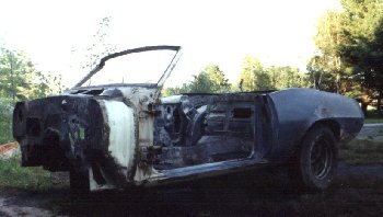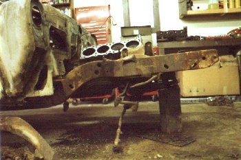 be pulled out because of the burs.With the motor and transmision pulled it was just a matter of removing the four bolts that held the subframe to the body. The removal of the subframe whould not be treated lightly. The re-installation of the subframe requires an accurate alignment to the body so that the front sheet metal fits properly and the car tracks straight going down the road. I was lucky I had a 1969 Camaro assembly manual (Firebird is not available). Since the subframes are the same the installation instructions are identical. According to the manual the front body mounts are aligned using two alignment pins. I took a few alignment measurements just in case. |