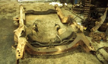 Here is the subframe when it was removed from the car. A lot of people removed the subframe and suspension, maybe replace a few ball joints and paint the whole thing and call it restoration. Then only way to do it right is to fully dismantle the suspension and restore all the main components. All bushing and ball joints are replaced. Brake lines and hoses should be replaced as well. It may cost an extra couple hundred dollars, but the car will ride like new. Besides, the repairs will never be as easy as it is when the car is dismantled.