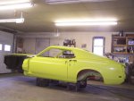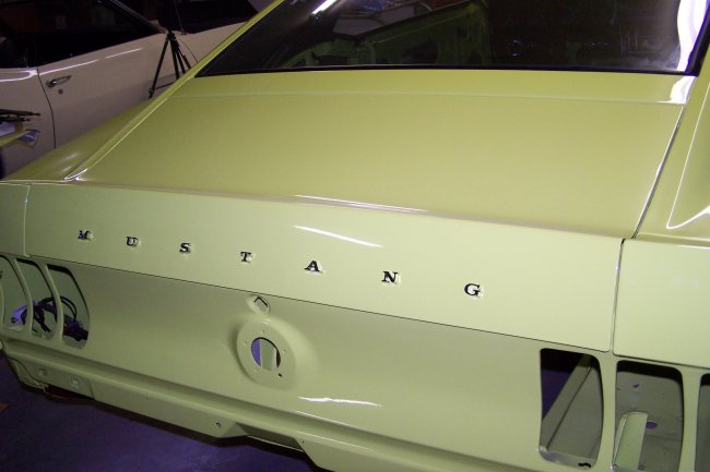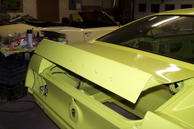 The trunklid and the rear quarter extensions are installed at the same since they have to be aligned together. In this picture the alignment has been completed and I'm getting ready to install the trunk MUSTANG letters.