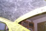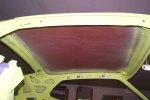 I covered the interior with a sheet of plastic and then sprayed the underside of the roof with 2 coats of 3M interior spray adhesive. I sprayed a good liberal coat of the same adhesive to the back of the new insulation. It absorbs a lot of adhesive so you have to use a lot. After allowing 15 minutes for the adhesive to setup I installed the insulation.