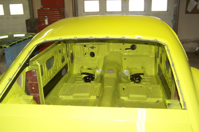 Next comes the sailpanels, but first the wiring for the sailpanel lights must go in. On the right side of the car (fastback only) there is a seperate wire that goes from the light, over the RH rocker panel and plugs in under the dash at the RH underdash light. The left side has a short harness that plugs into the main rear harness back towards the trunk. So you don't have to install the entire tail harness at this point if you don't want to.
