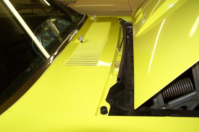 Here is view of the upper filler panel installed with the correct hardware. All of the hardware is supposed to be gold cad plated self-tapping hex screws, though you can get away with just silver cad screws. The washer jets are also gold cad plated. The screws I replaced with new hardware from AMK Products. The jets I replated using Castwell Platings Copy Cad kit. Though a little difficult to see here, there is a copper grounding clip screwed in place next to the weather seal. This clip was installed on all cars that were originally order with a radio. It was used to ground the hood to the car to reduce noise. Unfortunately the clip digs into the paint on the underside of the hood. I just benfd the ends f hte prongs donw so they don't hit the hood.
