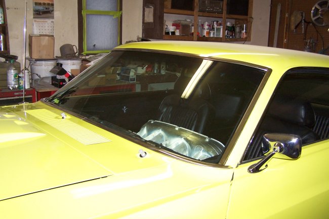 Here is the windshield after all of the mouldings have been installed. The lower moulding is screwed in place and goes in prior to installing the upper filler panel. The ends of the mouldings are screwed in place just inside the door jamb. The screws are supposed to be hex self-tapping screws which are gold cad plated.