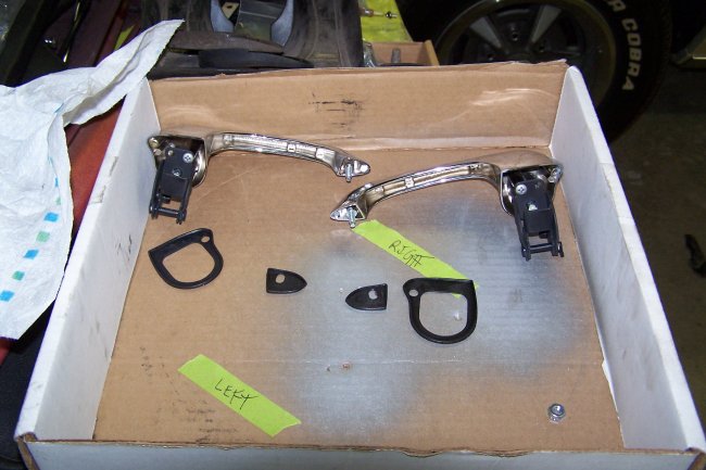Excellent quality door handles can be purchased at most of the Mustang parts suppliers. Though you do have to reuse parts from your originals. There is only a slight difference between the originals and the repos. As can be seen in this picture, the rod on the push button is much different, but it still works just as well as the original.
