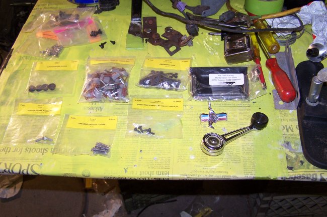 Now its time to install the door panels. Here is all the hardware necessary. I bought all of the the screws and clips new from AMK Products. It should be noted that this car has a standard interior with stereo speakers on the doors. In order for the door handles to clear the speaker grills Ford intalled door handles from deluxe interior cars.