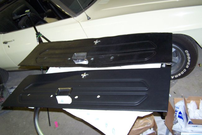 Here is a comparison of an original door panel with a reproduction panel with original hardware installed on it. You can tell that the repo material is grayish when compared to an original.