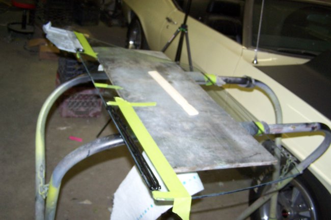 The brackets are then slid into place. Its important to get the glass to be centered in the channels of the brackets. If they are too cocked the glass will not align to the roof rail weather strip. In this picture the brackets and the vertical stainless moulding are glued in place. I use the same windshield adhesive to hold the vertical stainless moulding to the glass.