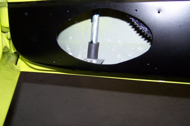 The mirror is mounted to the door using chrome machine screws and rivenuts. I installed the rivenuts on the door after the car was painted, as shown in this picture. Rivenuts are installed using a special rivetgun. After breaking a cheap gun installing a rivnut I bought a nice $75 one that really works. I do not suggest using just a nut and bolt kit that most Mustang suppliers sell. Its almost impossible to install them that way.