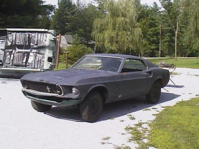 some of these changes based on my first overall inspection of the car. A dealer name plate was attached to the tail panel probably from the original dealership that the car came from, Koelle Greenwood Ford. The tag is long gone and the holes were filled with bondo. (If anybody out there has one or can locate one for me, please let me know). Very early in the car's life it must have been in a light accident since the hood had been changed and the car was repainted the original color. There was no evidence of damage to the radiator support or the remaining sheetmetal, so the damage must have been to the hood and grill. At that time the Mustang emblems had been removed and the emblem mounting holes where filled. This is where the car lost its Limited Edition 600 indentity, since the special decals were destroyed when the car was repainted. The car was probably taken well care of since I counted 6 service station decals inside the driver's door jamb area. They are illegible because they were later painted over with a crappy red paint job. Much later on in its life the rear quarters and the bottom outer corners of the doors were patched with bondo and the car was painted red, rather poorly. The inside of the door jambs was poorly covered with red paint. It was filled with lots of runs and the paint was semi-transparent. This is when the service station decals and tire pressure decal were painted over. Also at the time the original chrome remote mirror was removed and a set of cheap sports mirrors were installed. The typical conclusion from this is that the ownership of the car was transfered to a teenager that didn't like the lime green color and wanted to 'dress it up'. Sometime after that, things started to get messy. There was a set of hood locks installed where hood pins are typically installed. There is evidence of a manual choke since there was an extra hole drilled in the lower dash with a corresponding hole in the firewall at the level of the carburetor. Around this time a dual exhaust system was installed. Big holes were drilled under the back seat to mount the hangers. Another set of hangers were attached to either side of the gastank. The rear valance was either replaced or hacked-up at that time to make way for the dual exhaust. The primer was baked off the side of the frame rails and trunk pan by the gastank due to the exhaust positioning. Somebody was very lucky. In addition airshocks were installed, the trunk was painted with splatter paint, the main fuel line was replaced with a long piece of tubing and a stereo was poorly installed. The ground wire for the stereo was run along the dash and was screwed down under the middle of the passenger's sill plate. How bad of an installation is that ? Then things got worse. Inside the trunk big pieces of fiberglass mesh were used to stuff the ever increasing rust holes in the lower rear quarters. The rear quarters and lower outer corners of the doors were buried on the outside with even more bondo. The mounting pins for the roof pillar running horse emblems were ground off, probably because the emblems were missing. The left front fender was replaced. And then the whole car was primed with either a thick coat of dark gray or black primer that eventually cracked and faded to gray. The work on the car was probably abandoned for some time before it was sent to the salvage yard. I know that it was sold to the salvage yard by a Anthony D. Salvatore of Eddystone, PA around the year 2000. (Hey Anthony, if you are reading this please contact me). Once it made it to the salvage yard (Ritt Jones in Swedesboro, NJ) the car gradually lost a bunch of pieces, like the engine, pretty much everything in the engine compartment, the grill, the bumpers, the trunk lid, the side windows, the front & rear valance panels, the instrument cluster, the passanger pod and the rear interior trim. It also looks like it spend some time sitting on or very close to the ground. Areas of the rear suspension and front strut rods and braces had some residue of what looks like white paint. Basically it looks as if the car was sitting on the ground where there was a paint spill. I will erase the evidence of the car's sorted past by restoring it to a concourse driven state. |