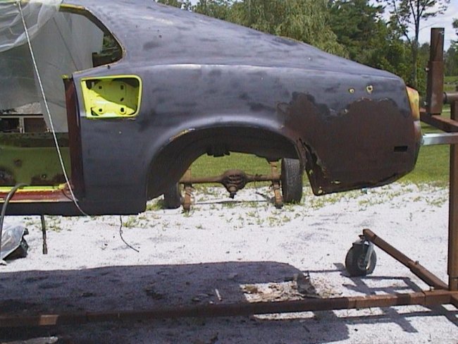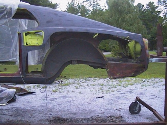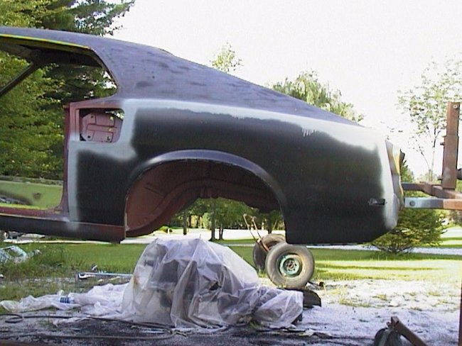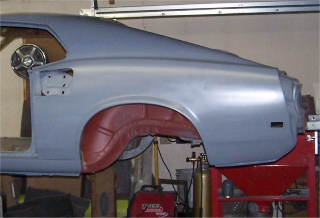 Then a couple liberal coats of Epoxy primer can be applied (I do not recommend POR15 for this). At this time its also a good idea to prime the inside of the new quarter panel since most of