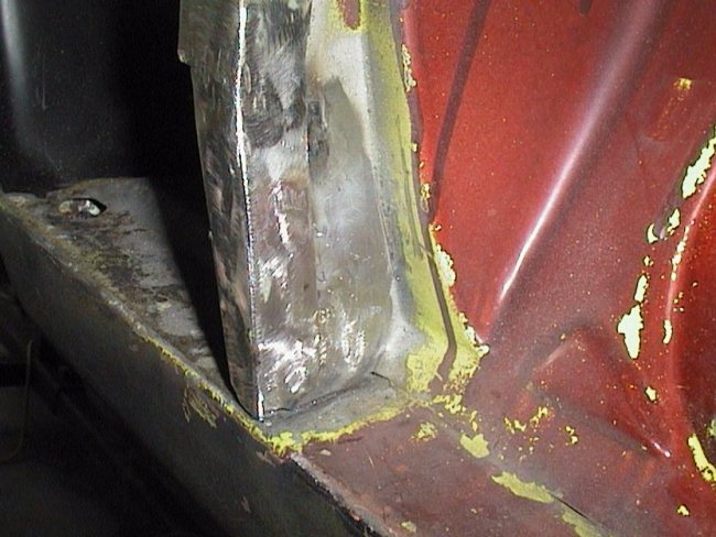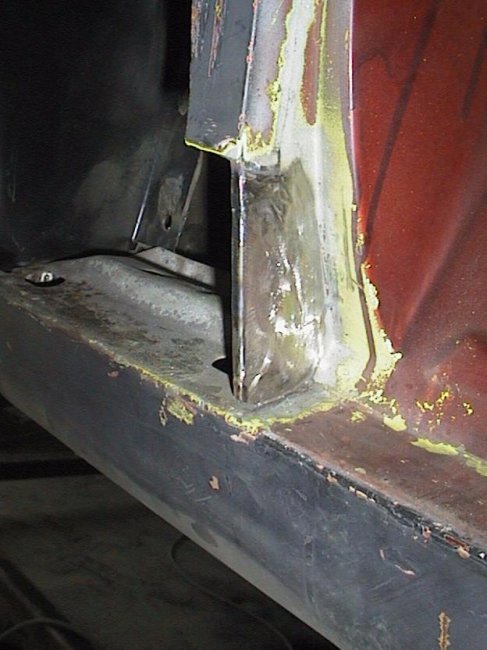 A common area for rust is at the lower door post where it meets the rocker panel. This needs to be repaired prior to the quarter panel installation. The first thing that is done is that the lower 4 or 5 inches of the remaining original quarter panel needs to be removed. This must be done carefully since the piece needs to be welded back in place. Then the rusted area is cut out and a new piece is fabricated and welded in. In this picutre the new pieces is already welded in and the weld has been ground down. Sorry, no pictures on how to do this, but as you read deeper into these restoration pages you'll see how to figure it out for yourself.